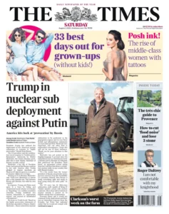 تصدّر خبر “نشر ترامب غواصات نووية ضد بوتين” الصفحة الأولى، حيث نقلت الصحيفة عن ترامب قوله: إن هذه الخطوة جاءت ردًّا على “تهديدات روسية شديدة الاستفزاز”. إلى جانب ذلك، تابعت الصحيفة ما وصفته بأسوأ أسبوع يمر به مقدم البرامج جيريمي كلاركسون، بعد الإعلان عن إصابة محتملة بمرض السل البقري في مزرعته ووفاة جروه المحبوب.