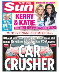 عنونت صفحتها الأولى بـ”ساحقة السيارات”، في إشارة إلى القرار القضائي المتعلق بتعويضات القروض. كما روجت لمقابلة حصرية مع كاتي برايس وكيري كاتونا، فيما يبدو محاولة للعودة إلى الواجهة الإعلامية.