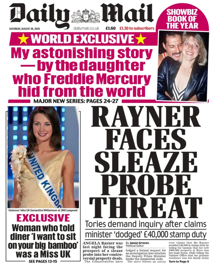 هيمنت التحقيقات التي تواجهها نائبة رئيسة الوزراء أنجيلا راينر، والجدل المتصاعد حول الفنادق المخصصة لإيواء طالبي اللجوء، على الصفحات الأولى للصحف البريطانية الصادرة صباح السبت، وسط تصاعد التوترات السياسية والاقتصادية.