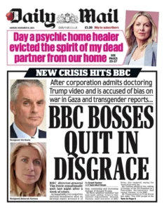 افتتحت الصحيفة بعنوان لافت: “رؤساء الـBBC يستقيلون في عارٍ تام”، مشيرة إلى أن ما حدث يمثل فضيحة إعلامية غير مسبوقة.