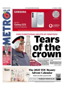 تصدرت الصفحة الأولى صورة للملك تشارلز وهو يؤدي التحية العسكرية عند النصب التذكاري في لندن، ووصفت الصحيفة المراسم بأنها لحظة مؤثرة ومفعمة بالمشاعر الوطنية.