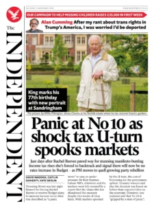 اختارت الإندبندنت عنوانًا لافتًا على صفحتها الأولى جاء فيه: “ذعر في مقر رئاسة الوزراء رقم 10 بعد تراجع صادم عن قرار الضرائب يهز الأسواق”.