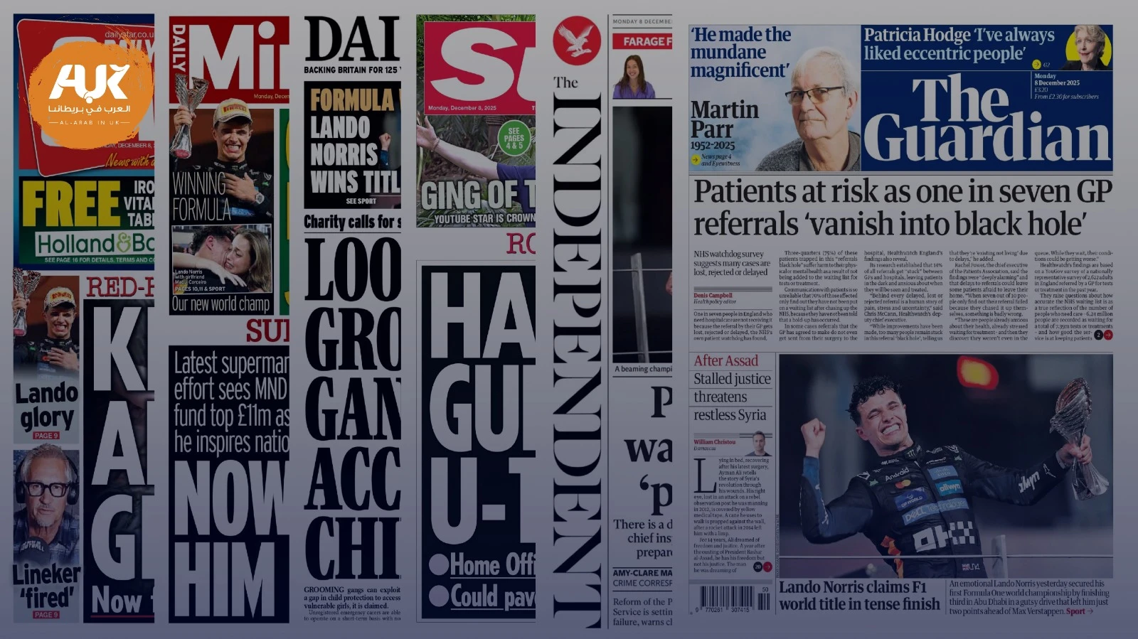 تقدّم الإندبندنت تحذيرًا من داخل قطاع العدالة في بريطانيا، ناقلةً عن مارتن جونز (Martin Jones) -وهو كبير مفتشي خدمات الإفراج المشروط- قوله: إن النظام يعيش حالة “أزمة دائمة”، وقد يُدفع إلى الفشل إذا جرى التوسع في خطط تعديل المنظومة بحيث يُعاقَب عدد أكبر من الجناة داخل المجتمع عبر التتبّع الإلكتروني بدل السجن. وترى الصحيفة أن مفتش الإفراج المشروط دعا الحكومة إلى التفكير “بجدية بالغة” قبل تنفيذ هذه الرؤية. وعلى الصفحة نفسها، أبرزت الصحيفة صورة لاندو نوريس (Lando Norris) وهو يحتفل بعد فوزه بلقب بطولة العالم للفورمولا 1 في أبوظبي.