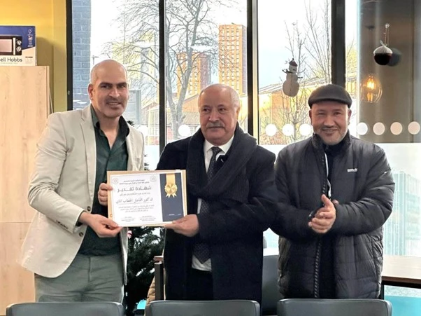 وكان مسك الختام بتكريم الدكتور الخطاب الماي، صاحب ديوان «مزداويات» ومؤلف كتاب «تحفة الرجال والنسوان في أحكام تجويد القرآن»، حيث ألقى كلمة عبّر فيها عن شكره وتقديره لجمعية الجالية الليبية في مانشستر، مثنيًا على جهودها المتواصلة منذ تأسيسها في خدمة الثقافة والهوية الليبية.