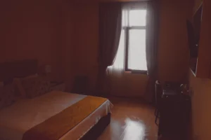 الغرفة خانقة؛ النوافذ مغلقة بإحكام حفاظًا على السلامة، والستائر مسدلة طوال اليوم لمنع الغرباء من النظر، والتكييف لا يعمل بانتظام.