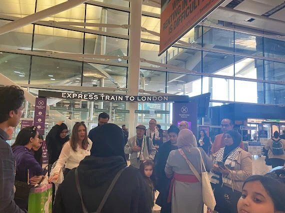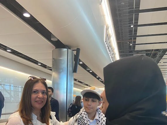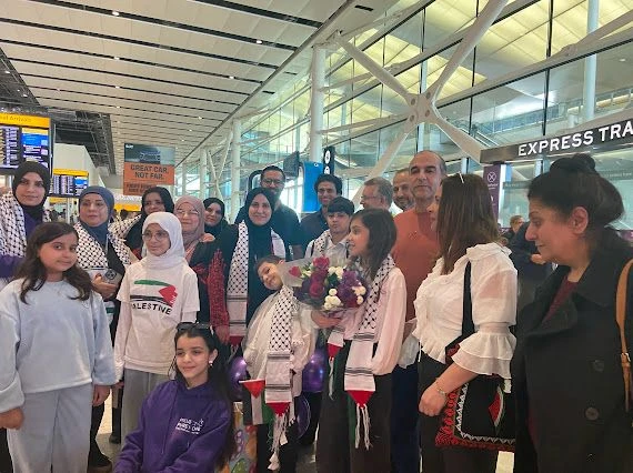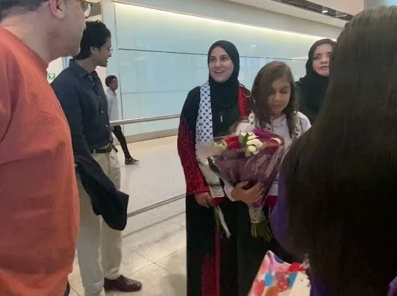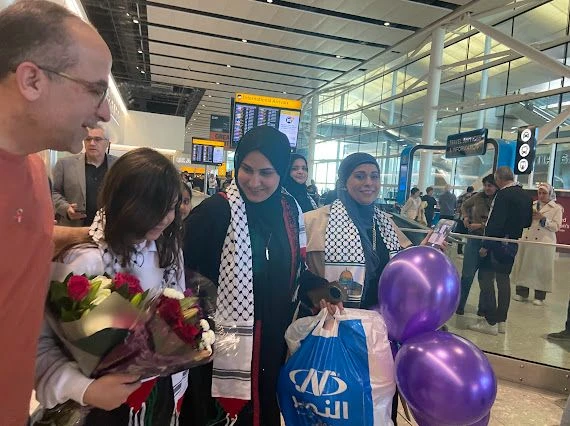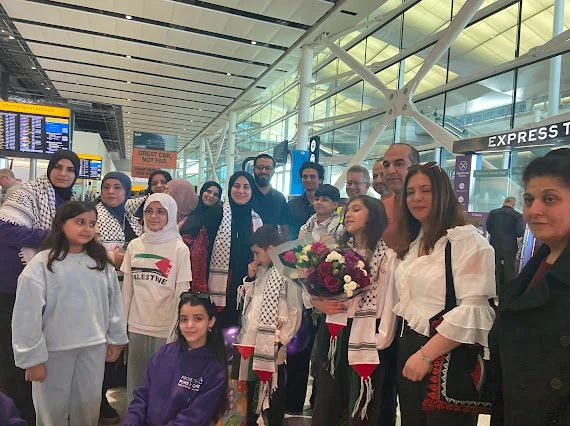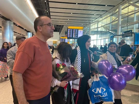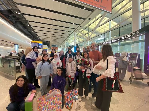شهد مطار هيثرو مشاهد إنسانية بامتياز، حيث احتشد متطوعون وأفراد من المجتمع العربي والفلسطيني في لندن لاستقبال العائلة بالورود وعبارات التضامن.