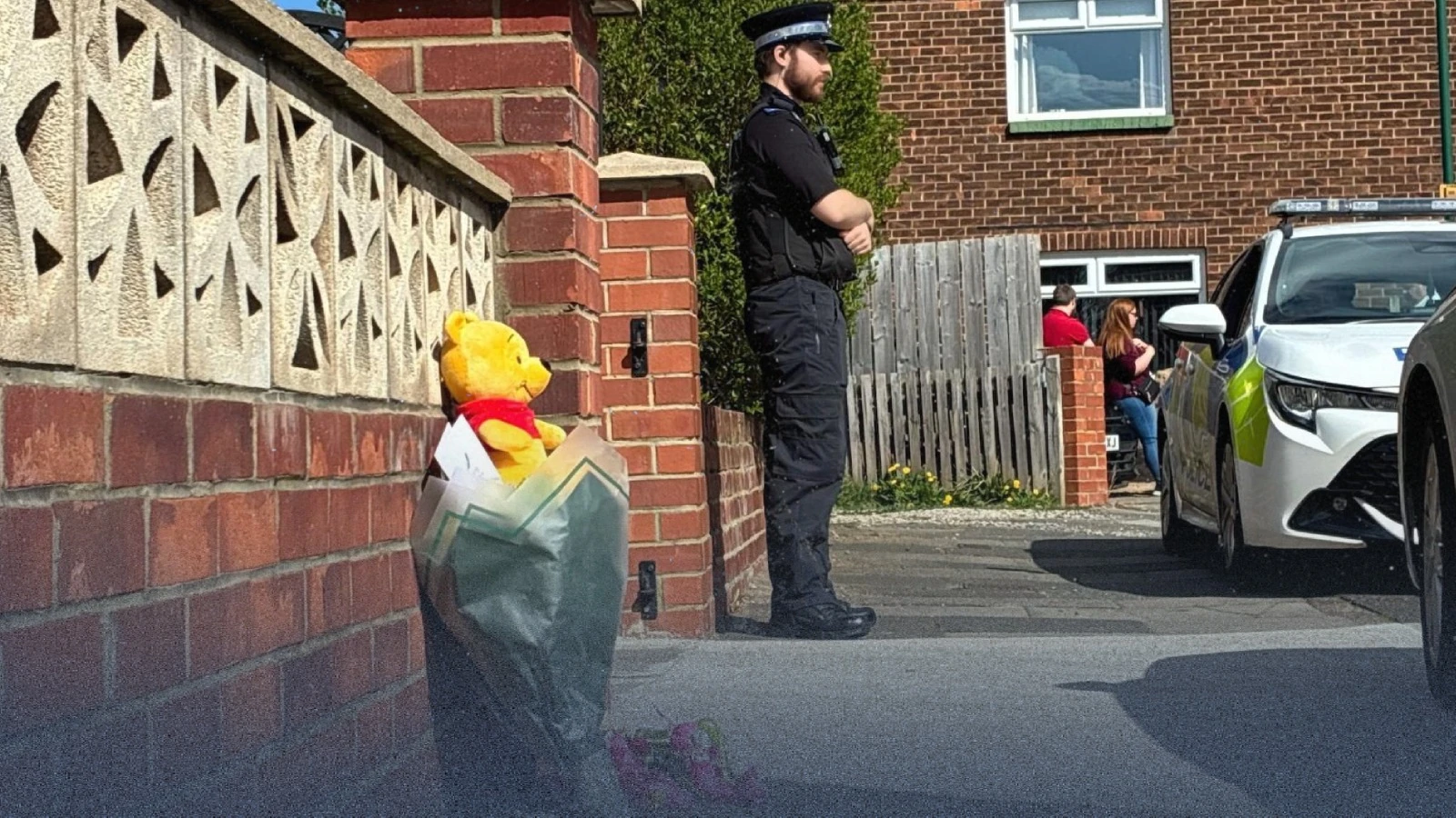 وُضعت الزهور ودمية أمام المنزل، في مشهد عكس حجم الصدمة التي خلفها الحادث في المنطقة.