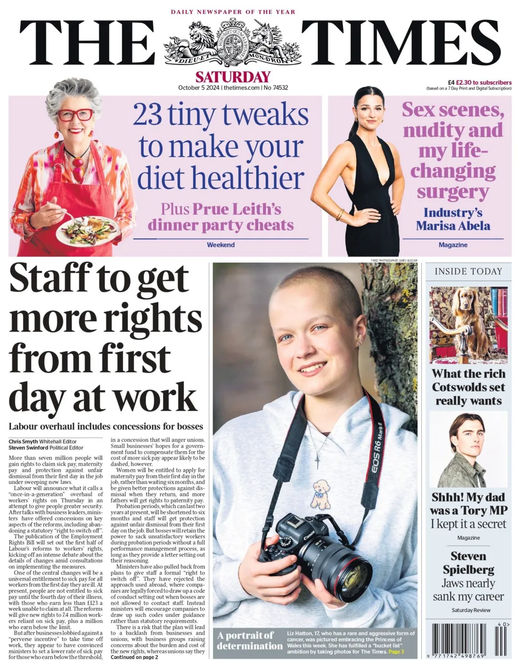 وفي سياق منفصل، نشرت الصحيفة صورة لمريضة السرطان ليز هاتون البالغة من العمر 17 عامًا، بعد أن حققت حلمها بلقاء الأميرة كاثرين التي عانقتها.