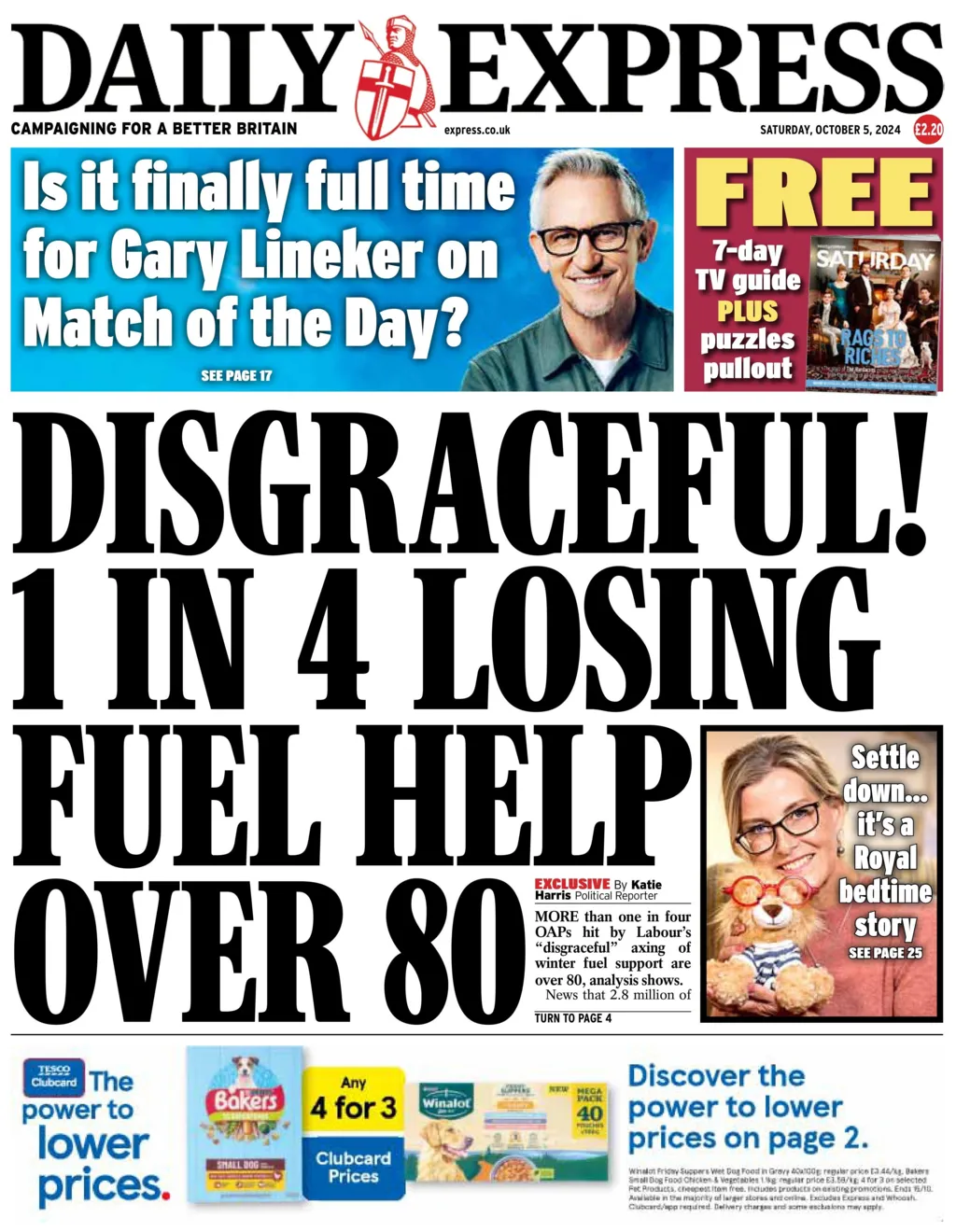 وصفت صحيفة “ديلي إكسبريس” قرار حزب العمال بإلغاء توزيع معونات الوقود الشتوي بأنه “مخزٍ”، وقالت الصحيفة إن واحدًا من كل أربعة أشخاص سيُحرمون من معونات الوقود، منهم كبار السن الذين تجاوزوا الثمانين عامًا.