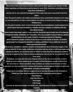 فعلى مدى الأشهر الستة الماضية، تعرّضنا لحملة ممنهجة من الهجوم والتشويه قادتها وسائل إعلام وشارك فيها بعض السياسيين، بسبب استخدامنا فنّنا ومنصّتنا للتعبير عن موقف واضح من سياسات إسرائيل وقوتها العسكرية التي تمارس احتلالًا غير قانوني. وخلال الفترة نفسها، ركّزت شرطة أفون وسومرست تحقيقها على جزء محدود من عرضٍ فنيٍّ كان من الواضح أنه لا ينطوي على كراهية أو تحريض، بل يعبّر عن تضامن إنساني صريح مع الشعب الفلسطيني.