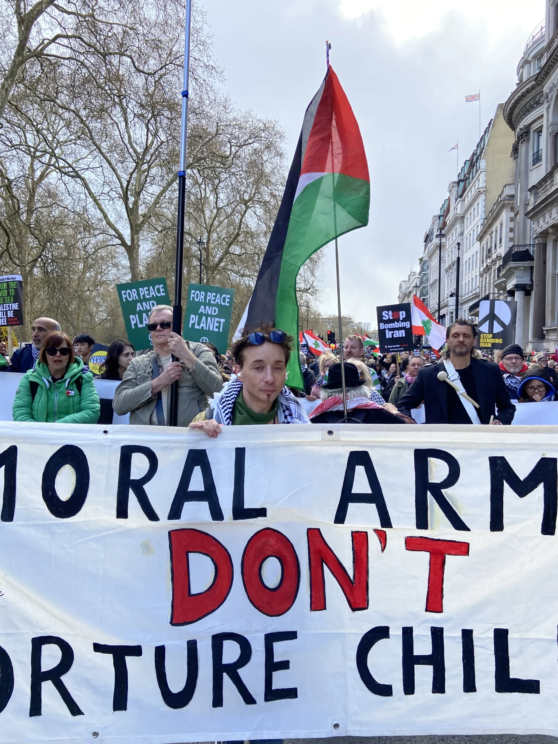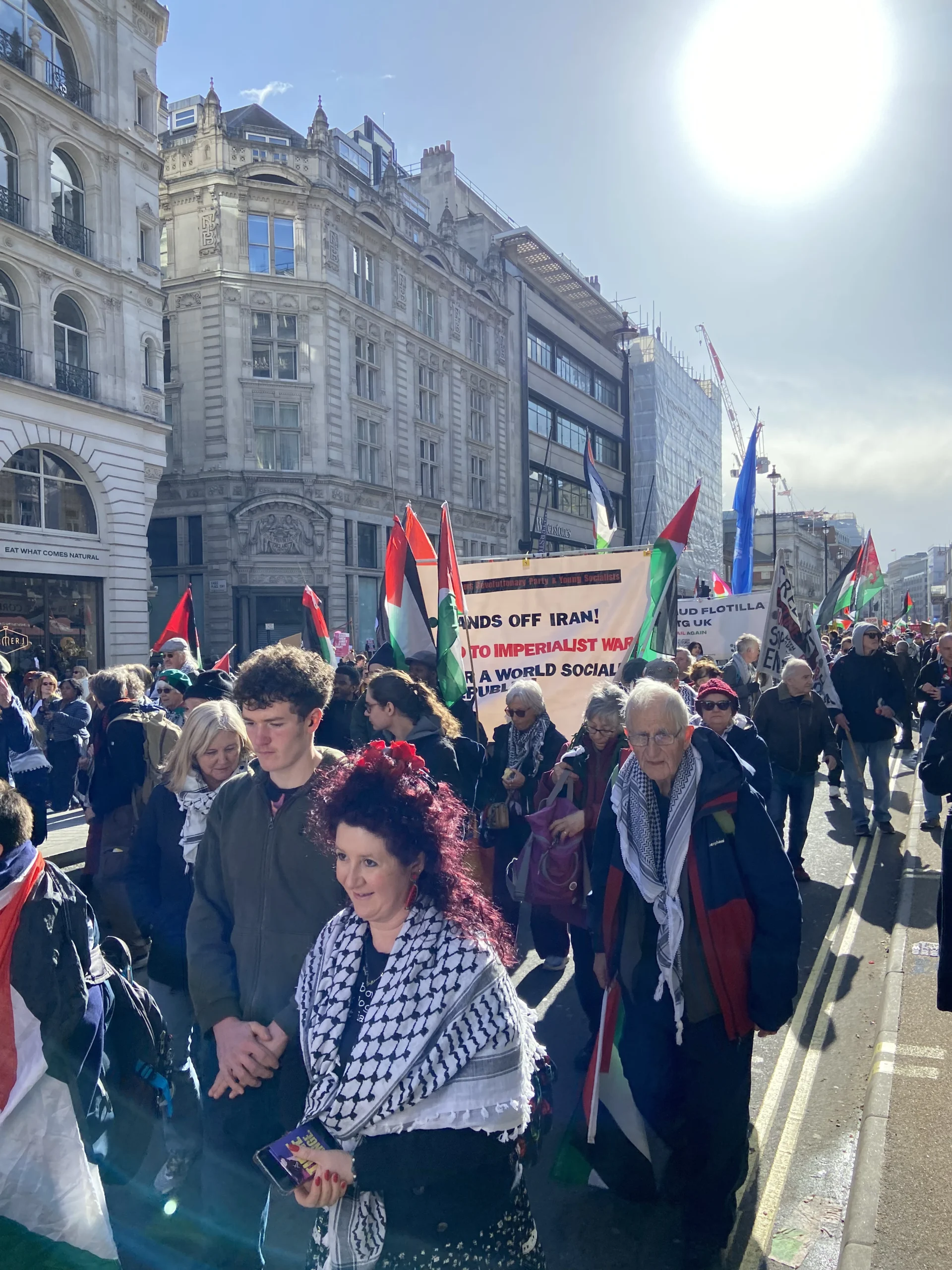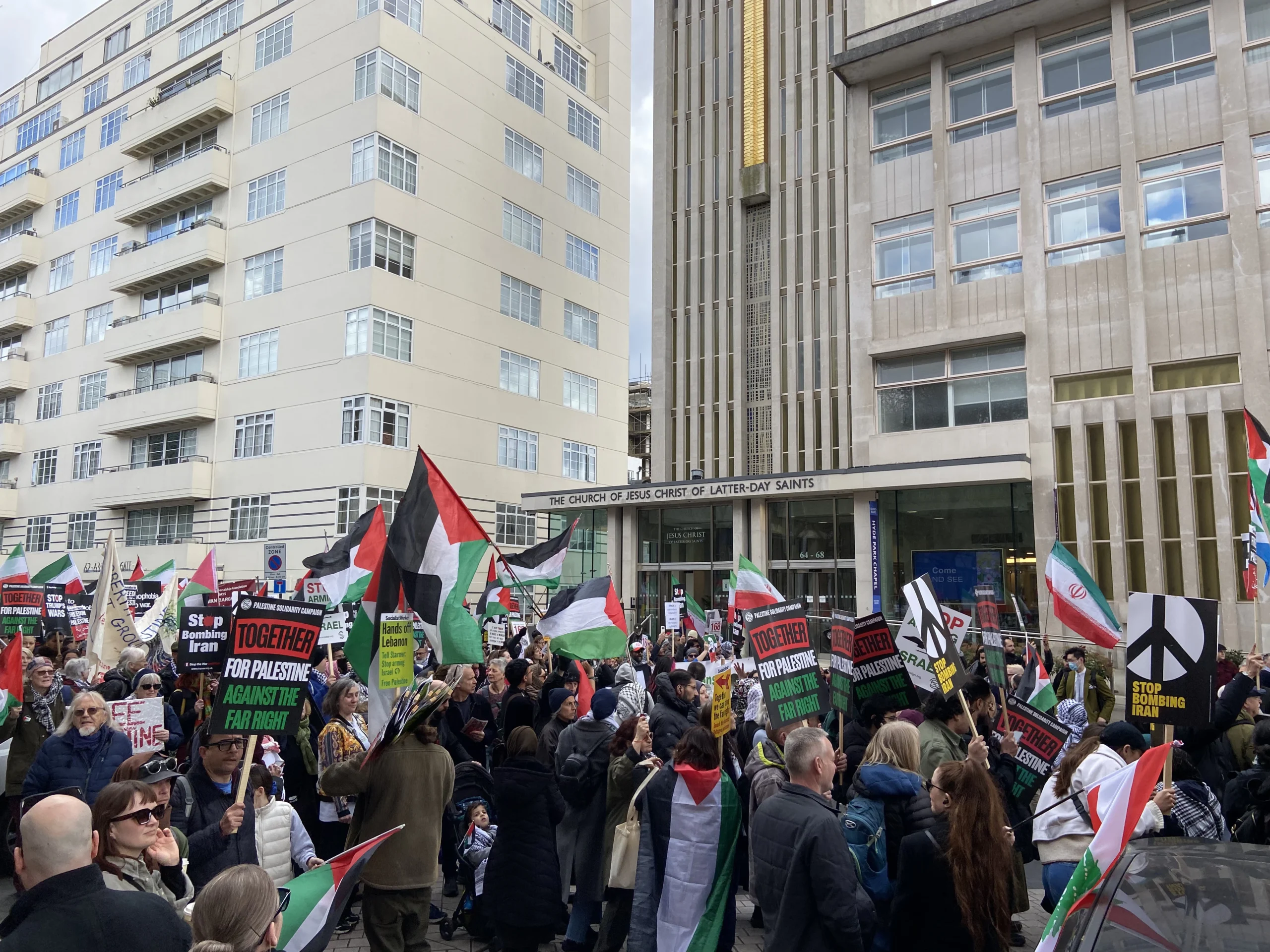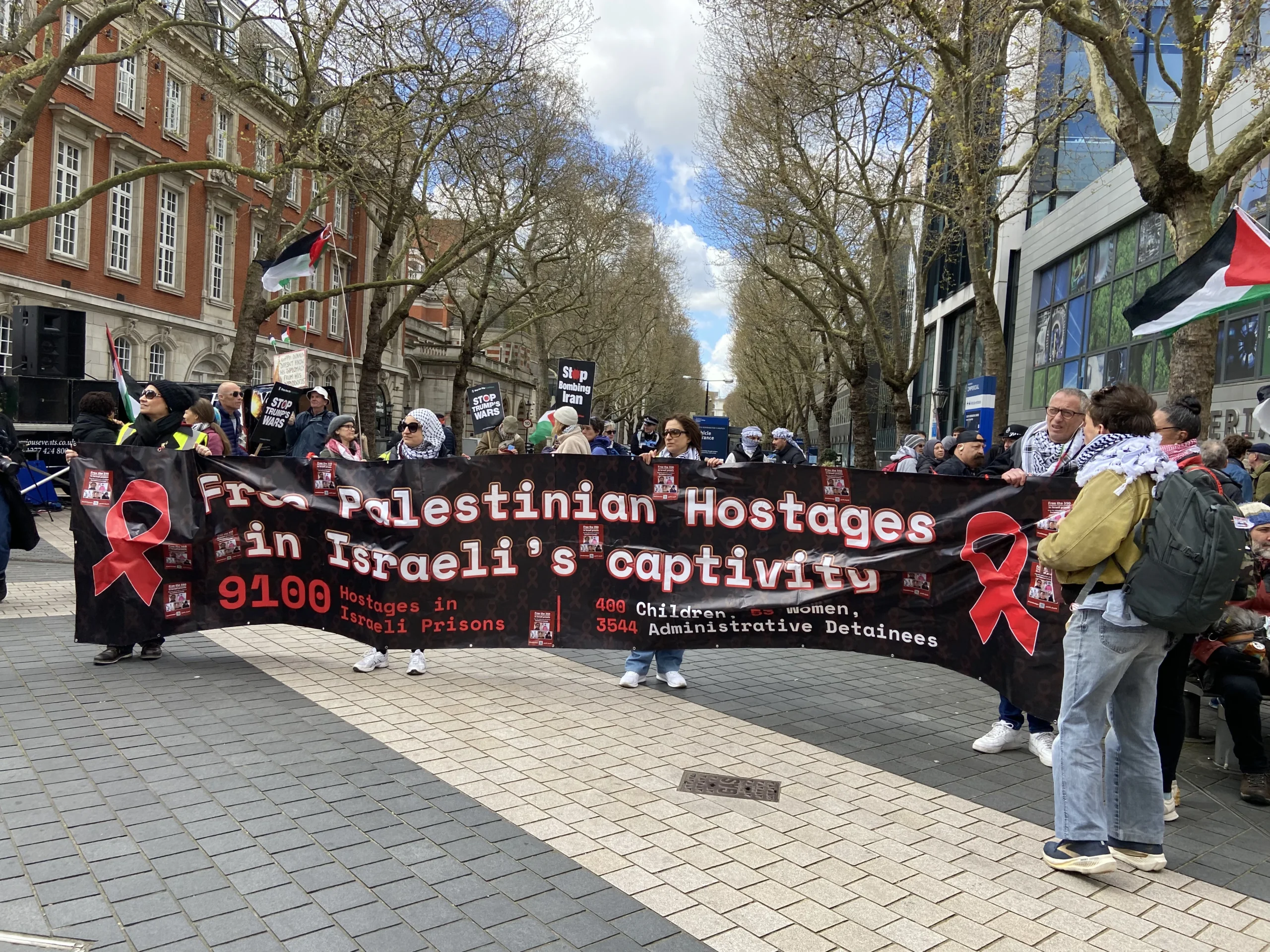 ورفع المشاركون شعارات تطالب بإنهاء الاحتلال الإسرائيلي ووقف الجرائم المرتكبة بحق المدنيين، كما عبروا عن رفضهم القاطع لسياسات الحكومة الحالية تجاه قضايا الهجرة والتوترات المتزايدة المرتبطة بملف إيران، محذرين من الانجرار خلف خطابات التحريض التي يقودها رموز اليمين مثل تومي روبنسون ونايجل فاراج.