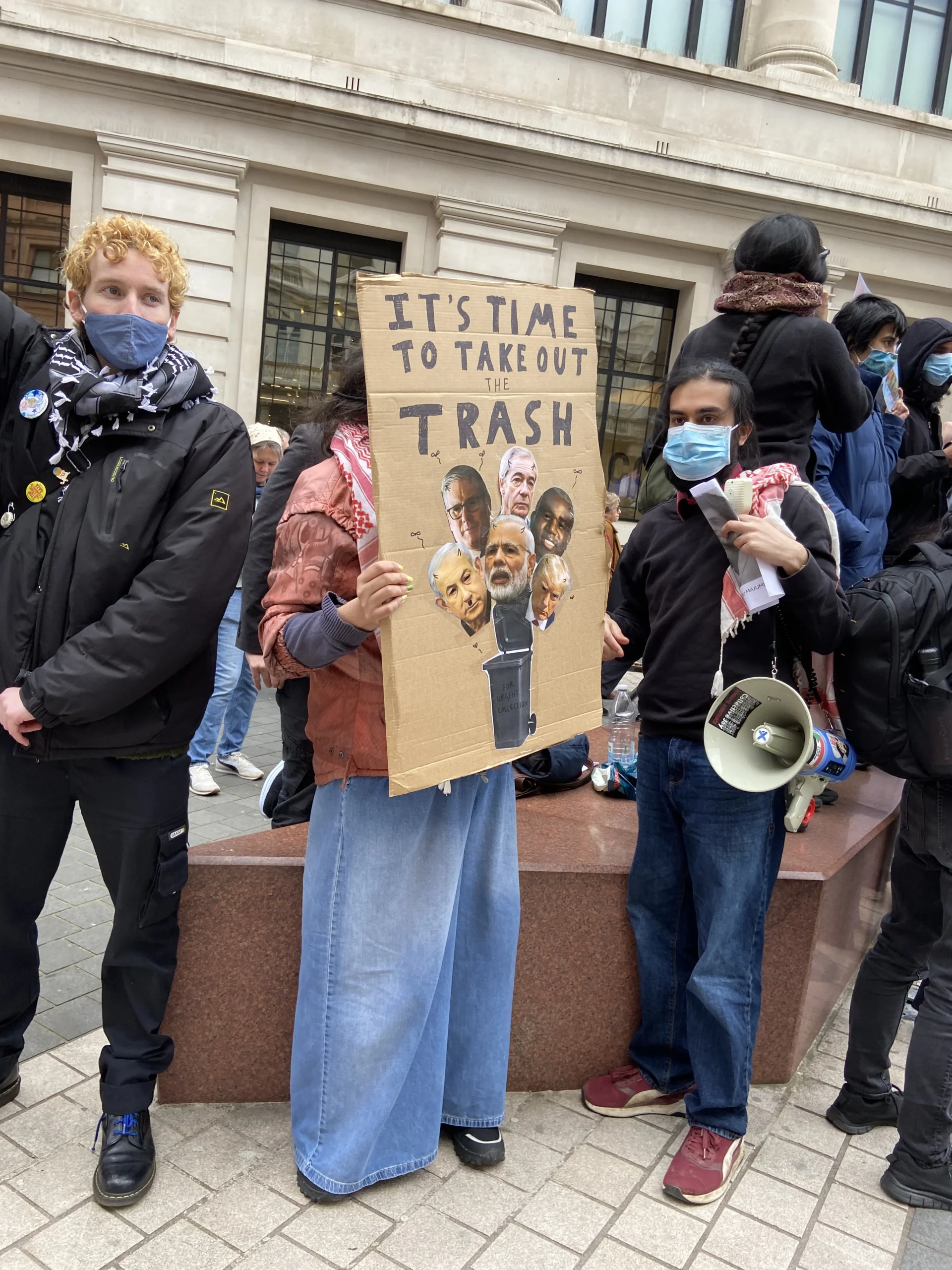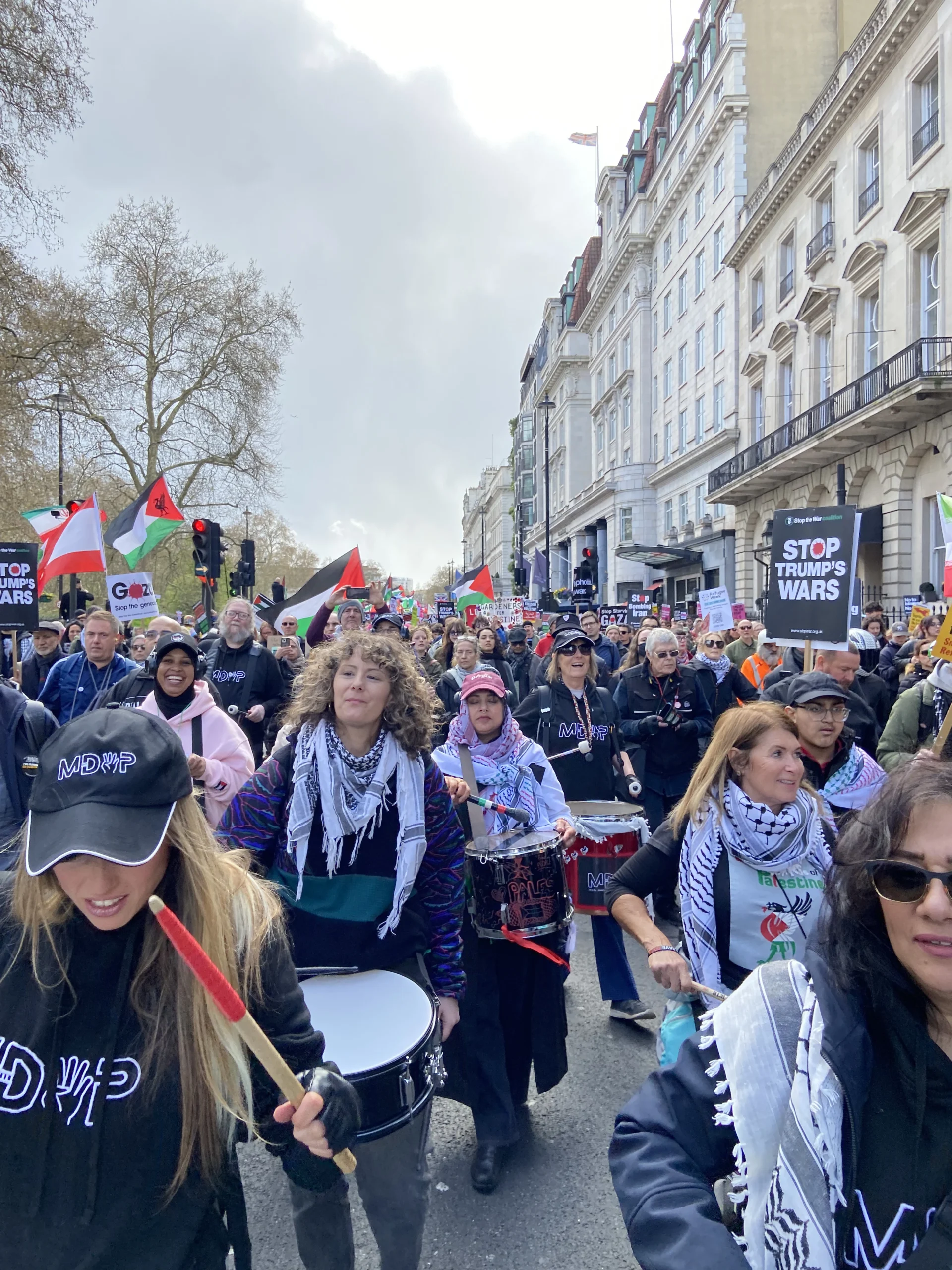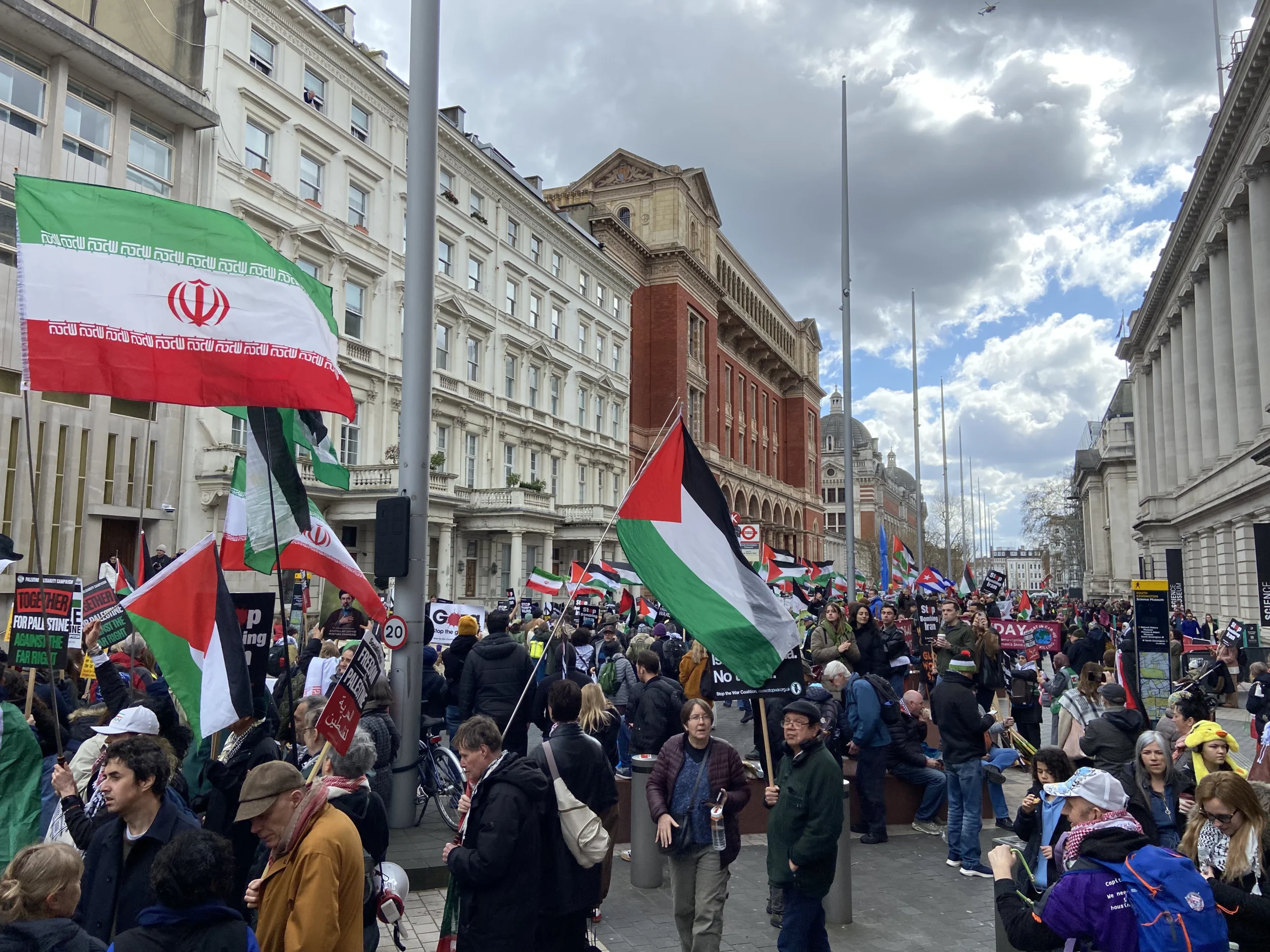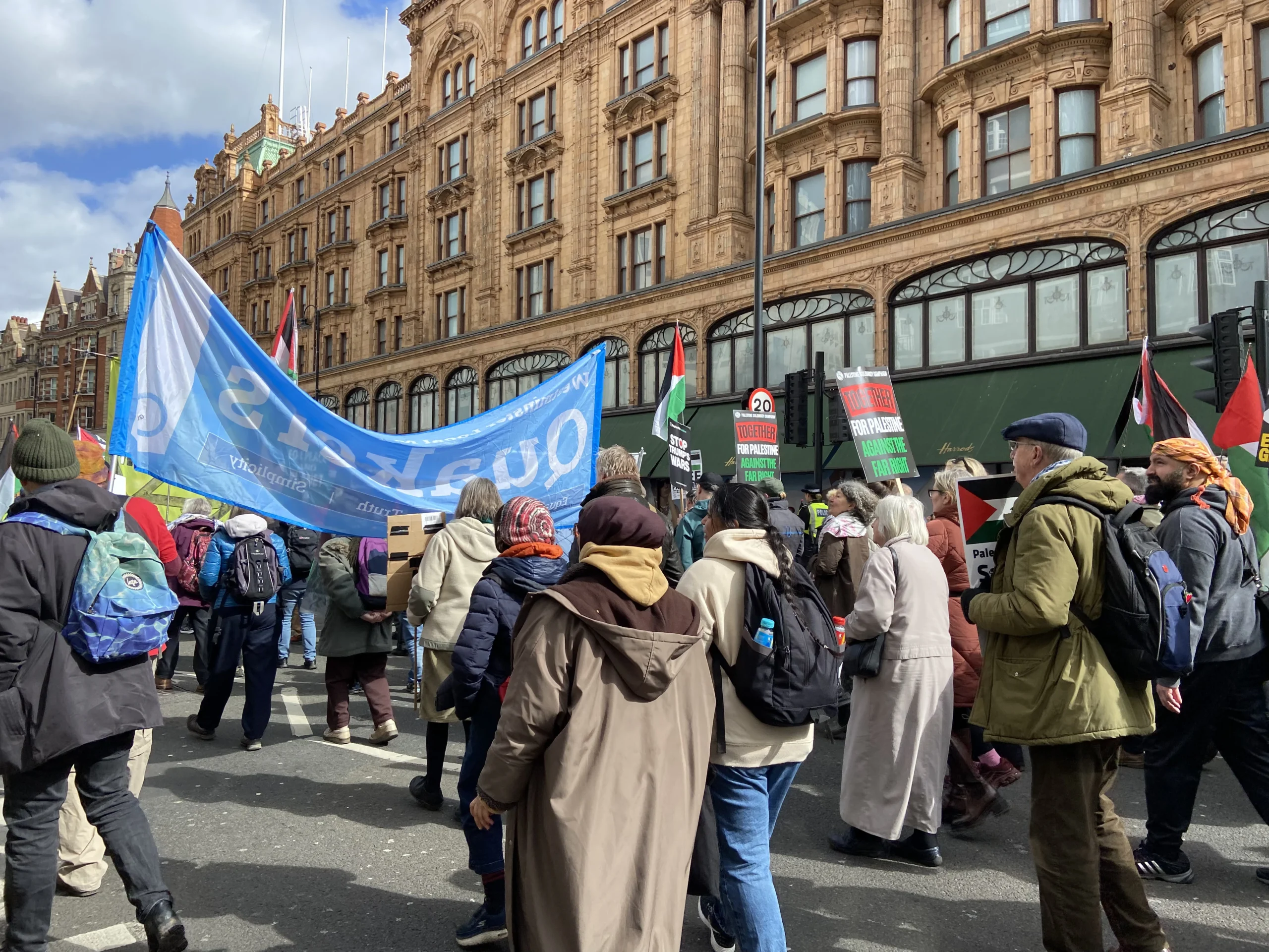 ورفع المشاركون شعارات تطالب بإنهاء الاحتلال الإسرائيلي ووقف الجرائم المرتكبة بحق المدنيين، كما عبروا عن رفضهم القاطع لسياسات الحكومة الحالية تجاه قضايا الهجرة والتوترات المتزايدة المرتبطة بملف إيران، محذرين من الانجرار خلف خطابات التحريض التي يقودها رموز اليمين مثل تومي روبنسون ونايجل فاراج.