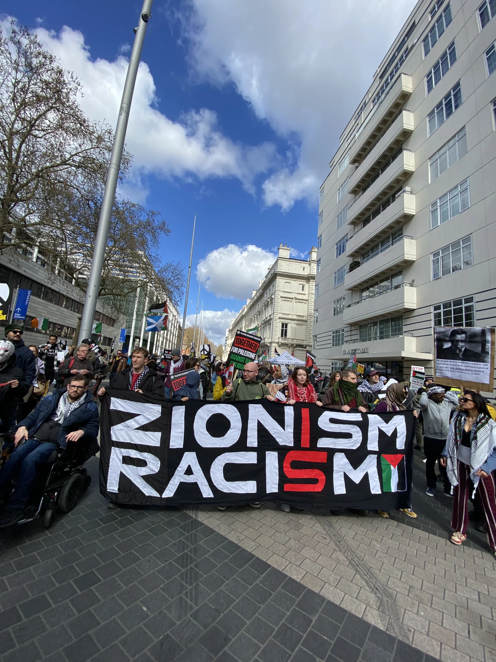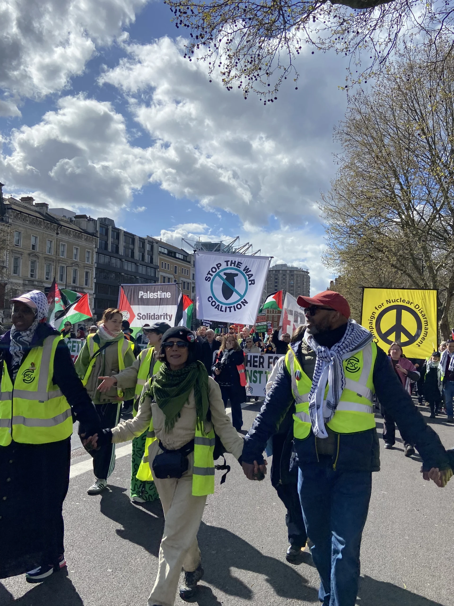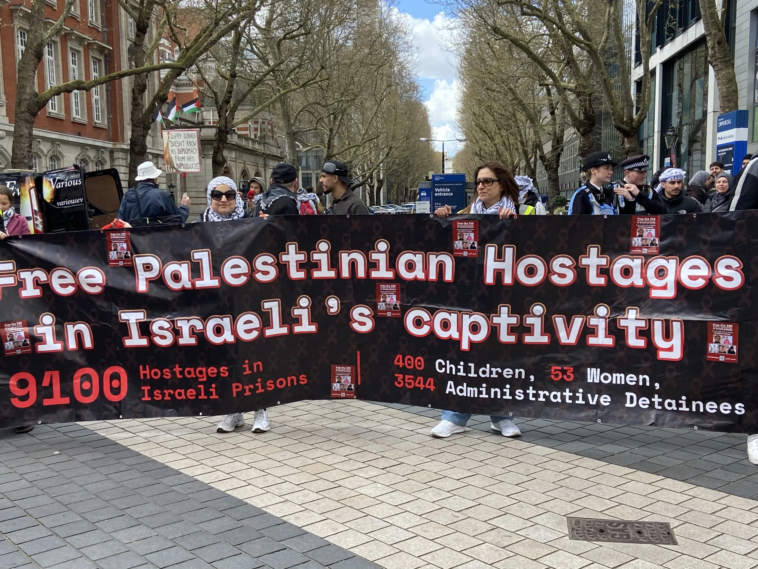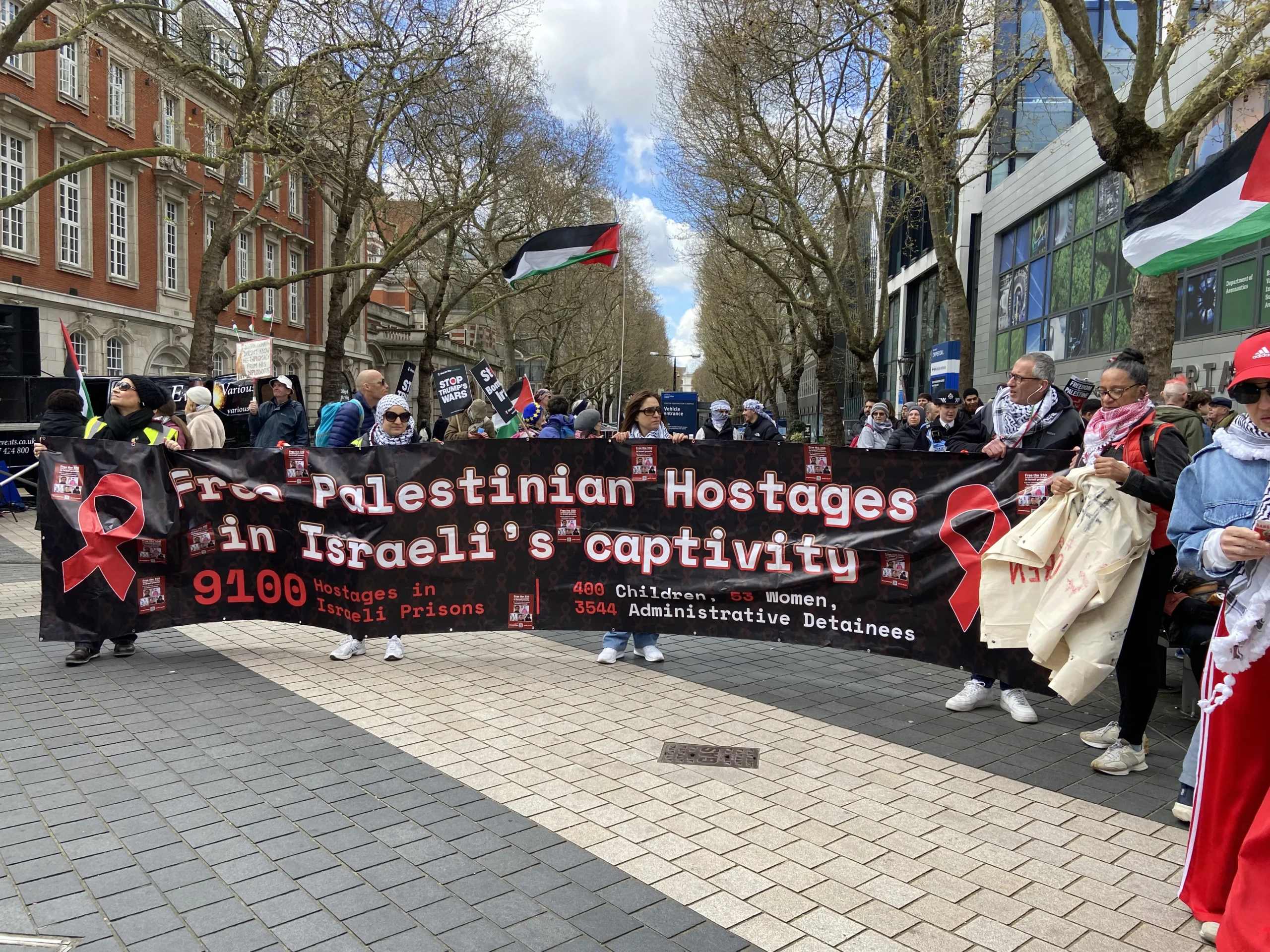 ونظم تحالف المنظمات الداعمة لفلسطين، الذي يضم: المنتدى الفلسطيني في بريطانيا (PFB)، حملة التضامن مع فلسطين (PSC)، منظمة أصدقاء الأقصى (FOA)، تحالف أوقفوا الحرب (Stop the War Coalition)، الرابطة الإسلامية في بريطانيا (MAB)، وحملة نزع السلاح النووي (CND) مسيرة بدأت من شارع Exhibition عند نهاية هايد بارك (SW7)، خلال الساعة 12 ظهراً.