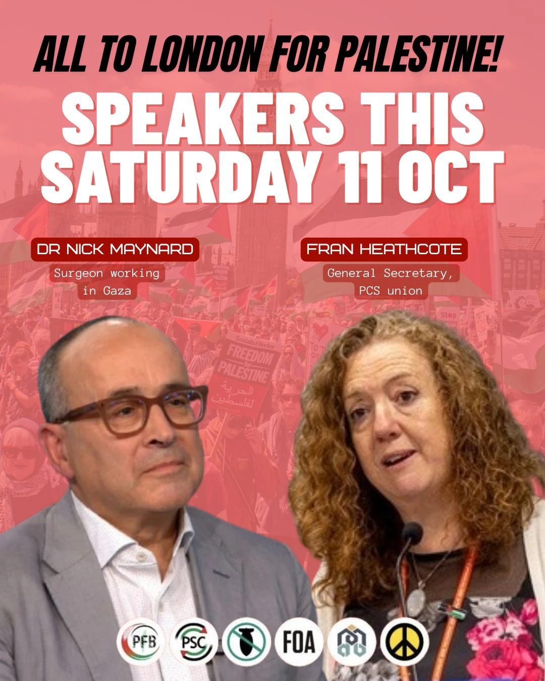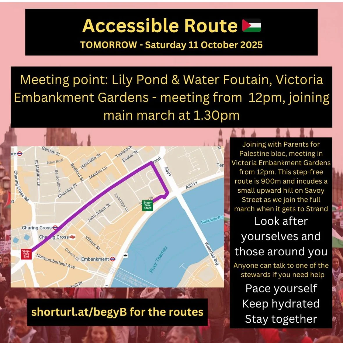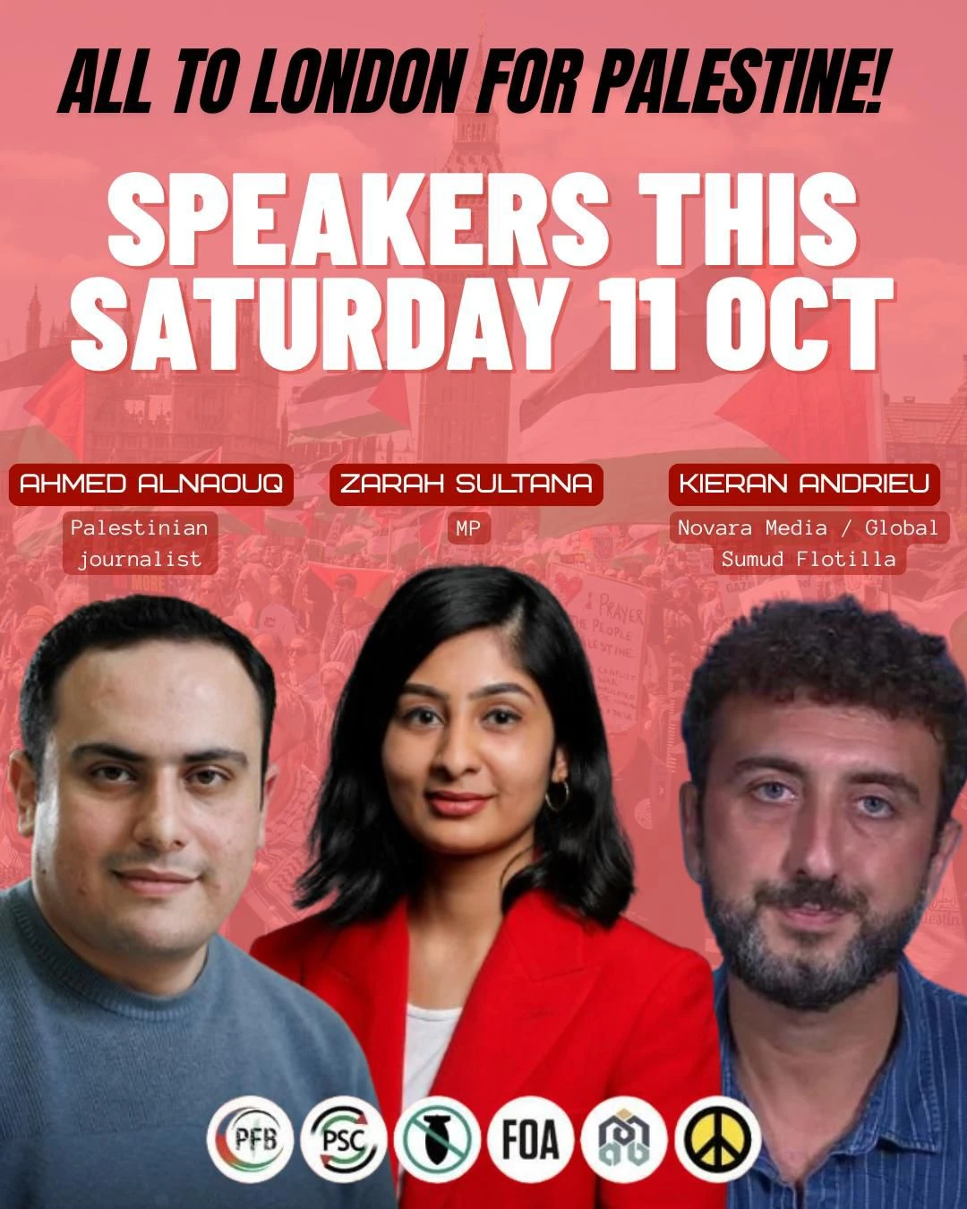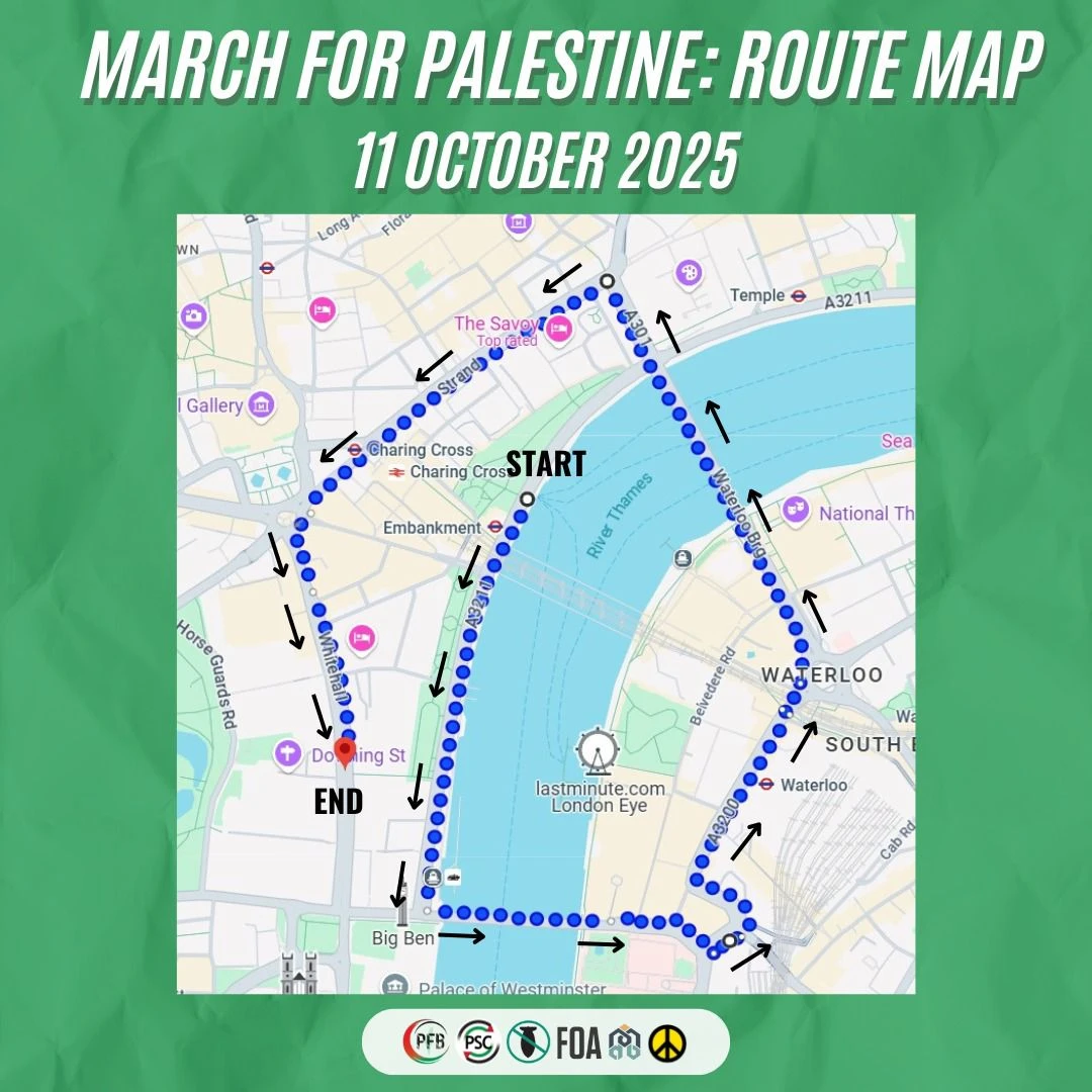 دعا التحالف المؤيد لفلسطين في بريطانيا إلى تظاهرة جماهيرية كبرى يوم السبت 11 تشرين الأول/أكتوبر 2025، تنطلق عند الساعة الثانية عشرة ظهرًا من منطقة فيكتوريا إمبانكمنت (Victoria Embankment) وسط لندن، تأكيدًا على استمرار النضال الشعبي والسياسي لإنهاء العدوان على الشعب الفلسطيني ودعم حقه في الحرية والعدالة وتقرير المصير.