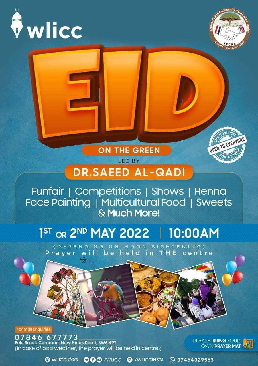 دعا المنتدى الفلسطيني في بريطانيا لإحياء سنة صلاة عيد الفطر المبارك الذي من المتوقع أن يصادف يوم الاثنين الثاني من أيار/ مايو، والاحتفال به في قاعة بايرون هول غرب لندن بإمامة المقرئ المصري المعروف الشيخ محمد جبريل، مع إقامة صلاتين للعيد: الأولى في تمام التاسعة صباحًا والخطبة باللغة الإنجليزية، والثانية في الساعة العاشرة صباحًا والخطبة باللغة العربية.