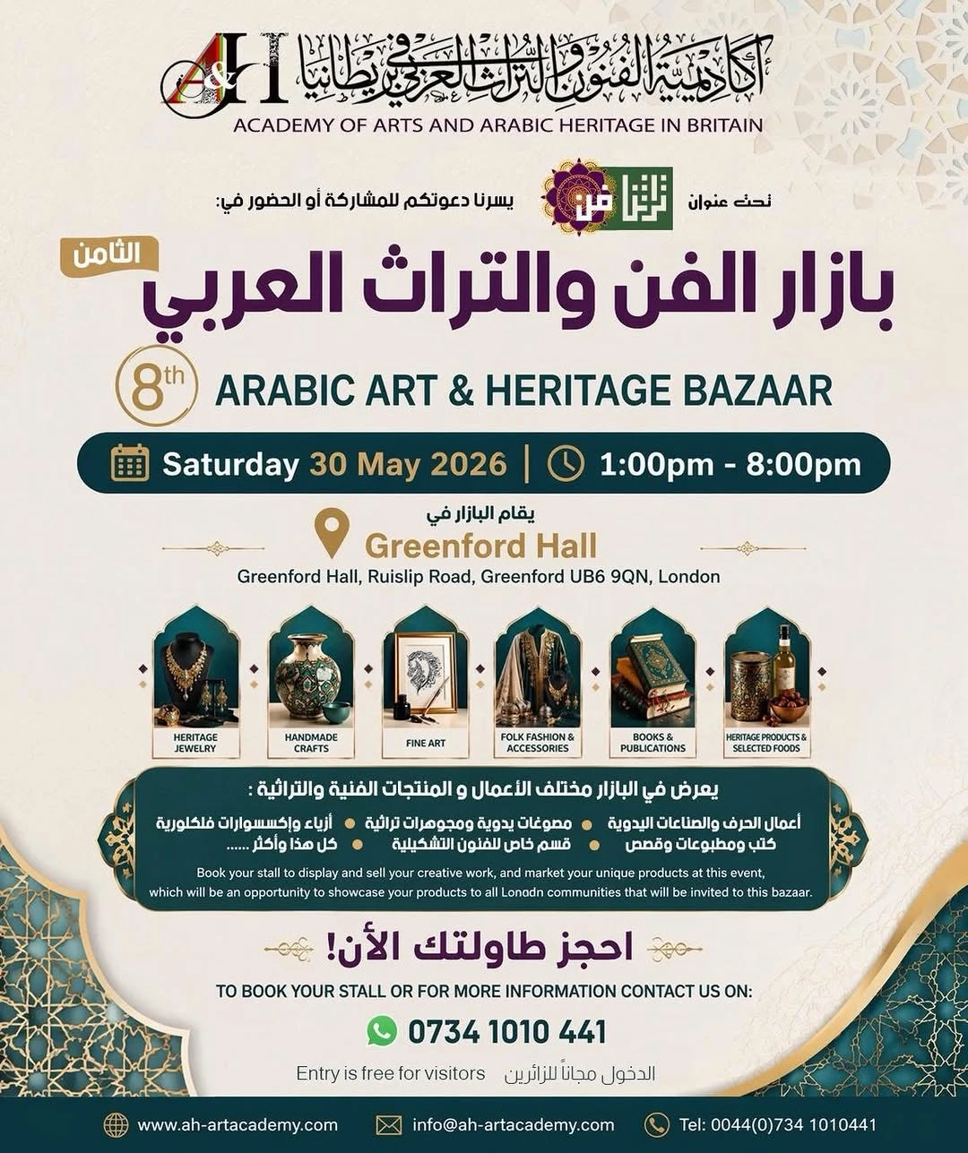 تعلن أكاديمية الفنون والتراث العربي في بريطانيا عن تنظيم النسخة الثامنة من حدثها السنوي المرتقب “بازار الفن والتراث العربي”، والذي يُعد منصة رائدة للاحتفاء بالمنتج التراثي ودعم المبدعين والحرفيين من أبناء المجتمع العربي في بريطانيا.