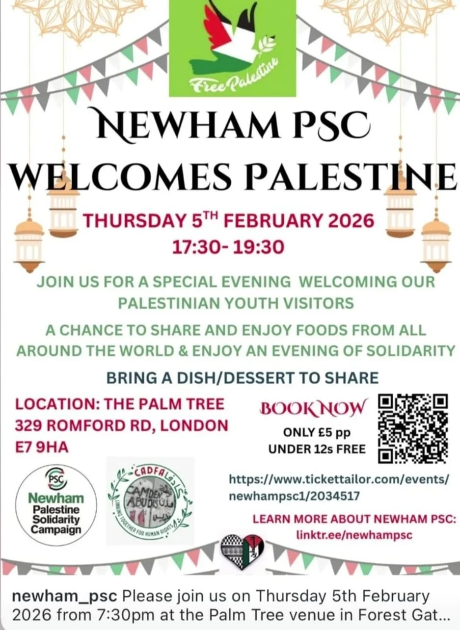 تنظم مؤسسة نيوهام للتضامن مع فلسطين (Newham PSC) أمسية تضامن خاصة للترحيب بالشباب الفلسطينيين الزائرين، في لقاء يجمع بين الدعم، المشاركة، والوقوف مع الحق.
