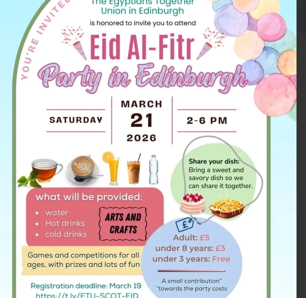 يتشرف اتحاد إدنبرة (Union in Edinburgh) بدعوتكم لمشاركتنا أجواء الفرح والبهجة في حفلة عيد الفطر المبارك. يوم يجمع الجالية في عاصمة اسكتلندا لنحتفل سوياً بروح العائلة الواحدة.