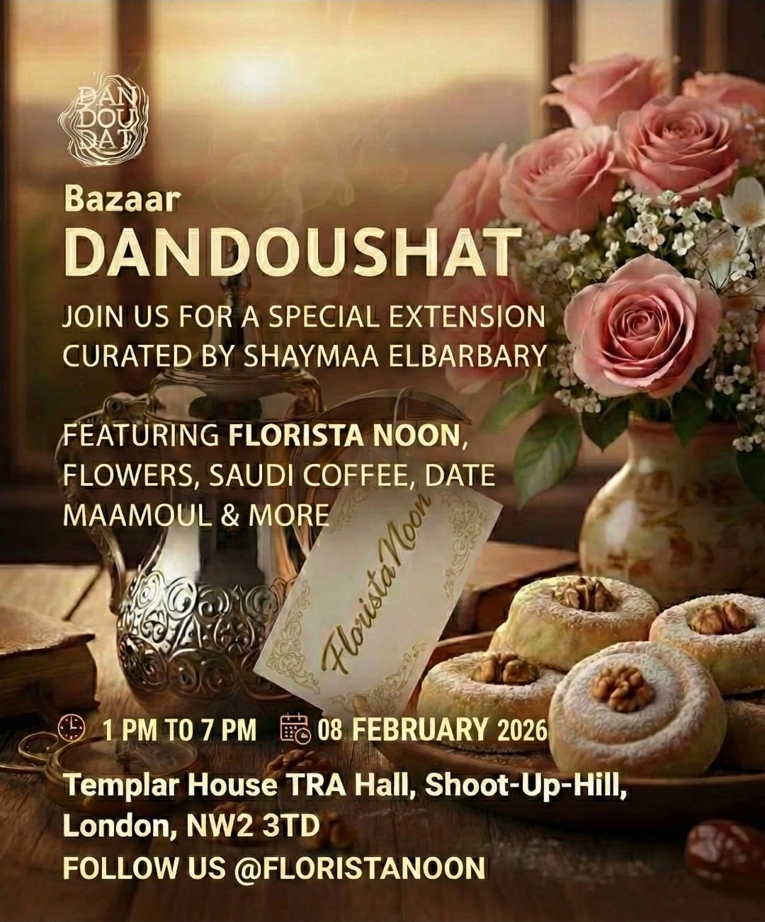 يُنظَّم بازار دندوشات في لندن استعدادا لرمضان 2026، بإشراف Shaymaa Elbarbary، وتقدّم تجربة تجمع عناصر منسّقة بعناية تشمل Florista Noon والزهور والقهوة السعودية ومعمول التمر، إلى جانب إضافات أخرى.