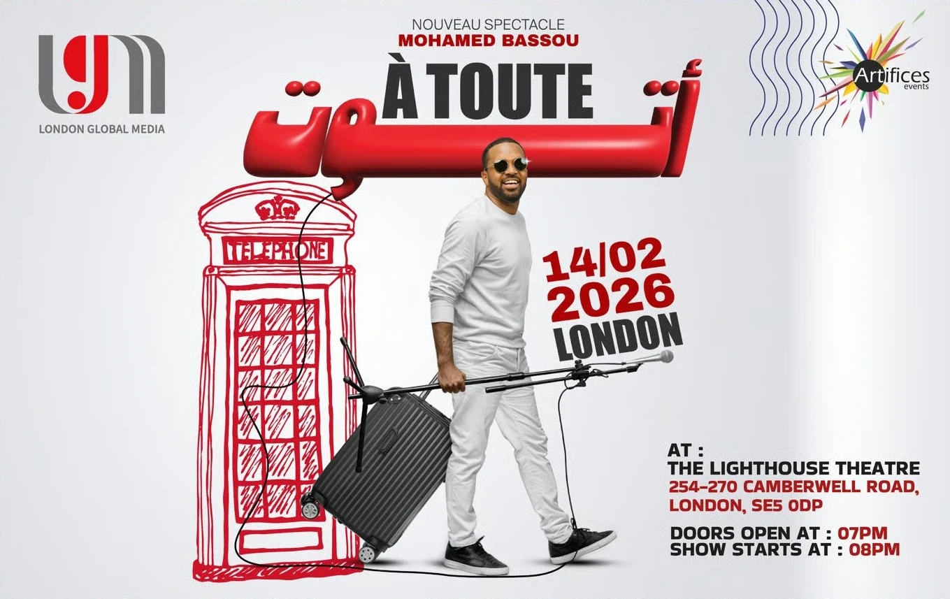 ستكون لندن على موعد مع أمسية فنية خاصة بعنوان “Mohamed BASSOU – London Show (A TOUTE)”، يقدّم خلالها الفنان محمد بسو عرضًا كوميديًا مميزًا لجمهوره في لندن، في حدث يُعدّ الأول من نوعه ضمن سلسلة فعاليات قادمة.