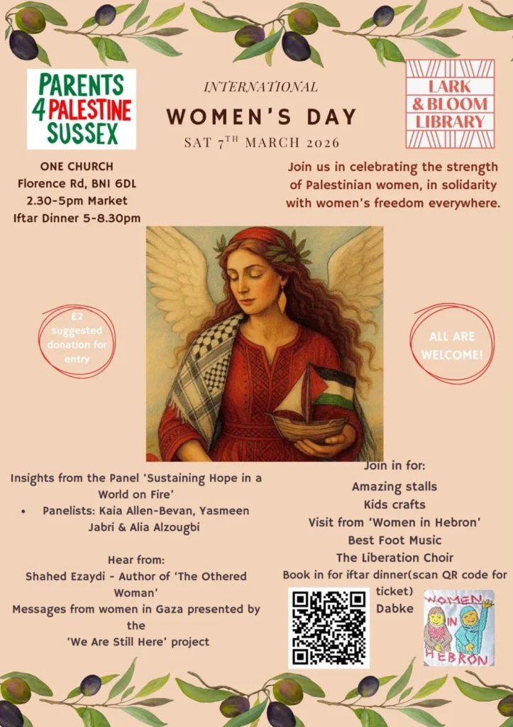 تحت شعار “الاحتفاء بقوة المرأة الفلسطينية”، تنظم مجموعتا (Parents 4 Palestine Sussex) و(Lark & Bloom Library) فعالية خاصة بمناسبة يوم المرأة العالمي، وذلك للتعبير عن التضامن مع نضال النساء وحريتهن في كل مكان.